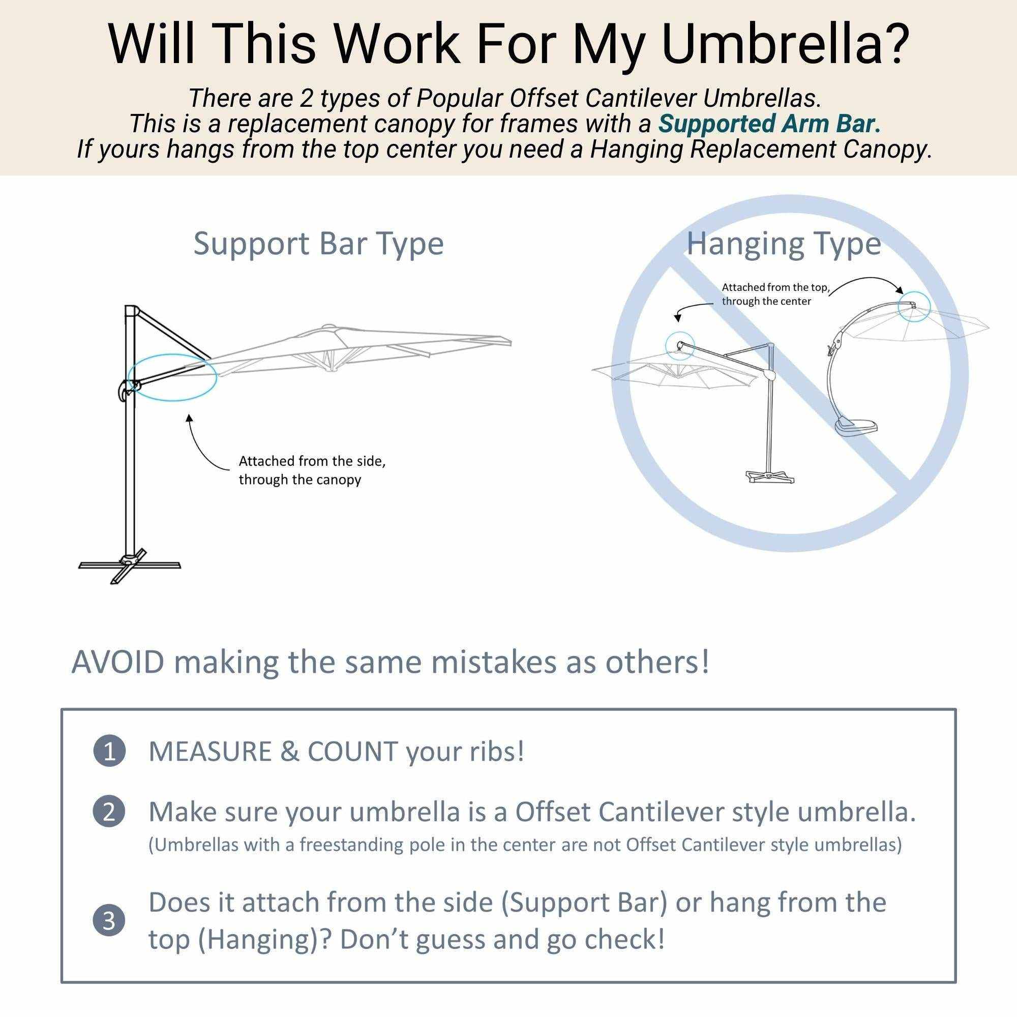 • Replacement Patio Umbrella Canopy made to fit off-set or cantilever umbrellas with supported bar arm style canopy