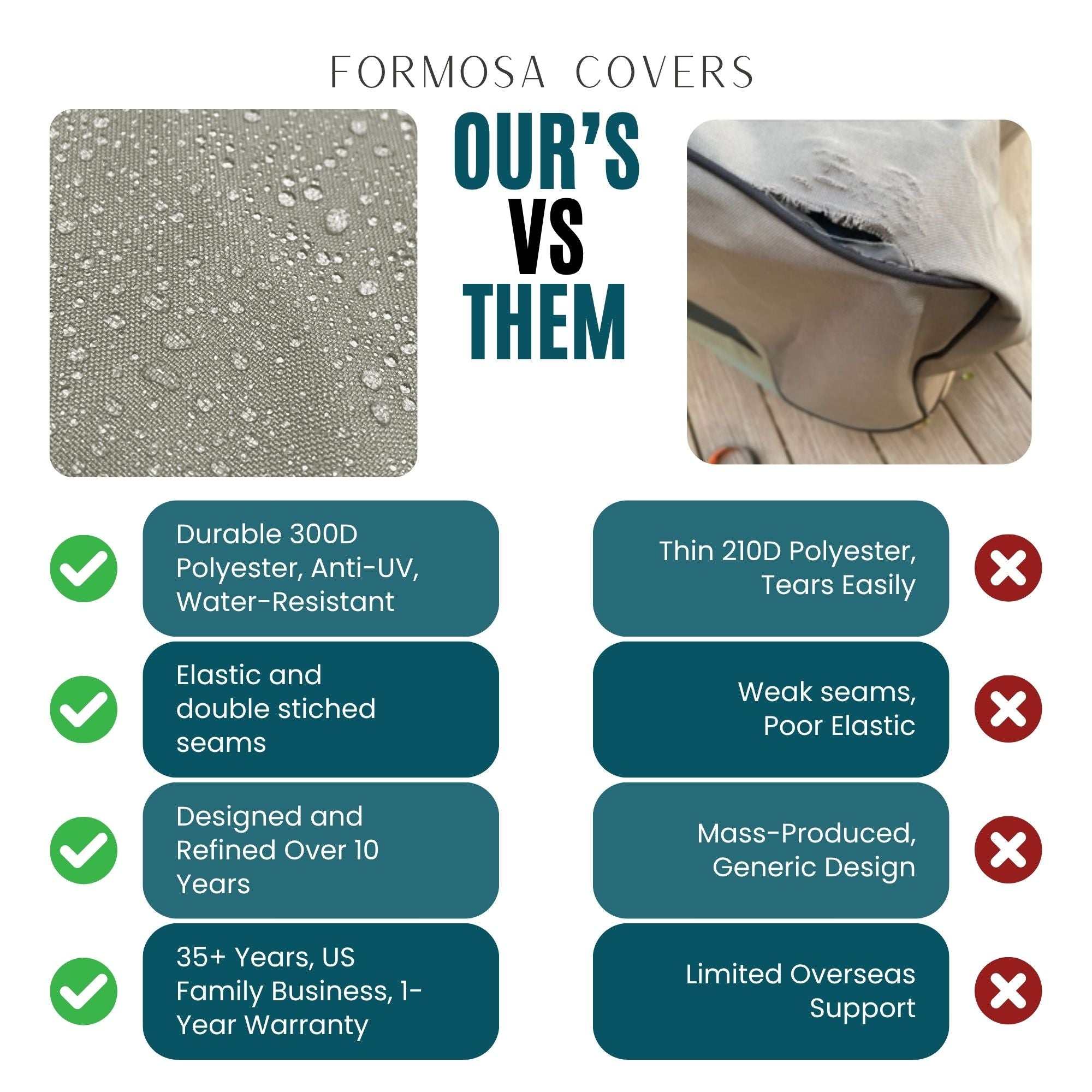 Crafted from 300 x 300 polyester fabric with a PU undercoating, this cover features a water-repellent treatment and UV-protective top coating to guard against fading, cracking, and weather damage. The elastic hem around the bottom ensures a snug, secure fit, while the adjustable buckle strap prevents shifting or blowing away in windy conditions. When not in use, simply fold and store it in the included compact carrying bag.