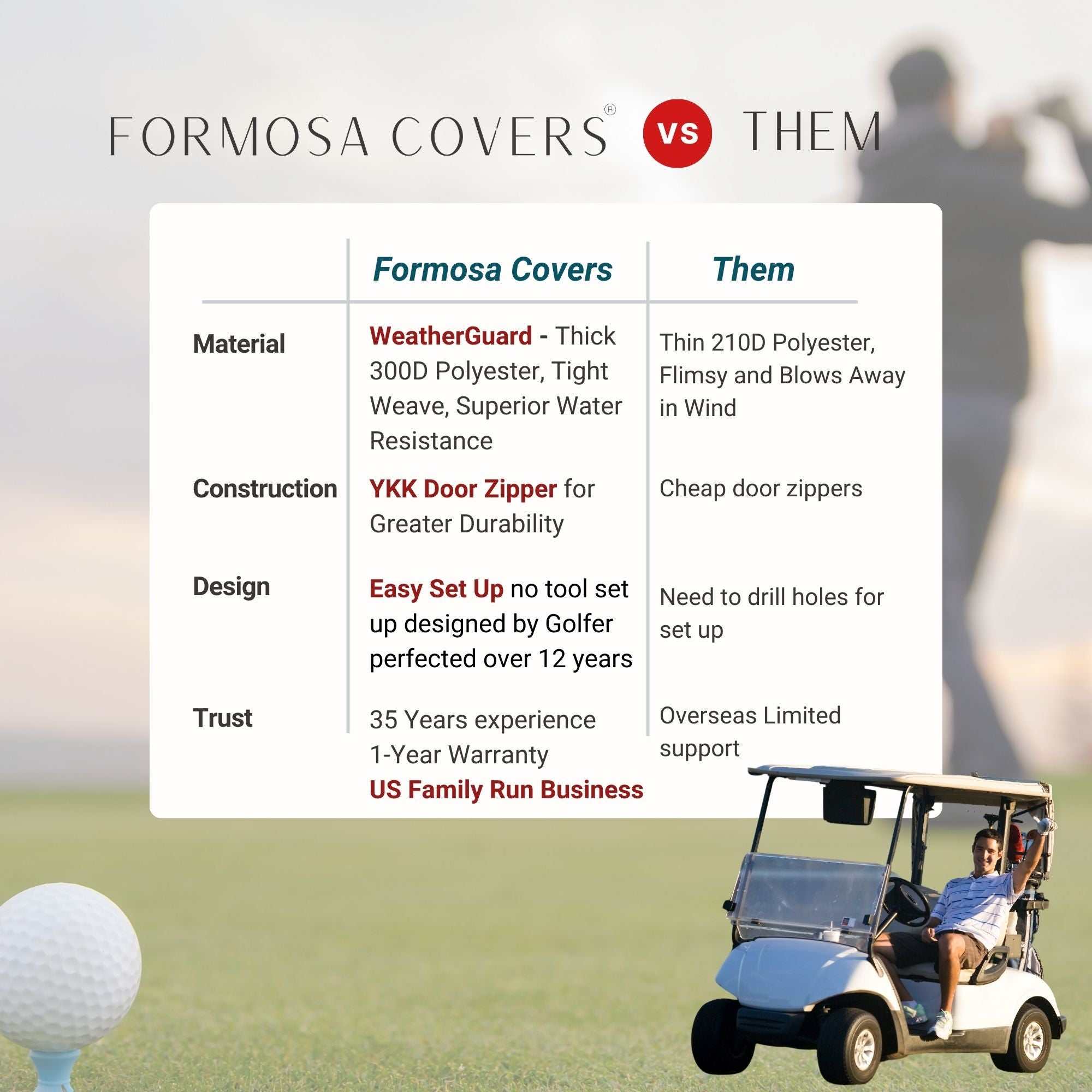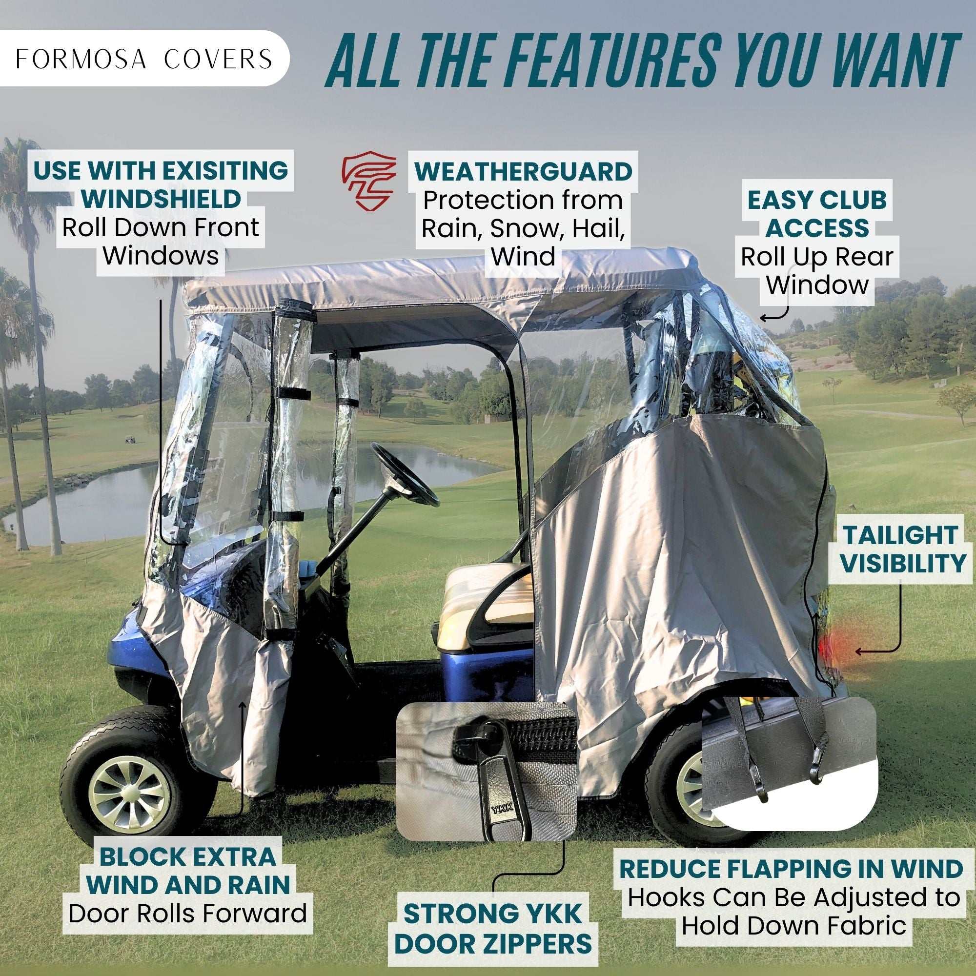 Drive Protected—Rain or Shine with an all-weather golf cart cover. For over three decades, Formosa Covers has been the trusted name in golf cart protection. Our driveable golf cart enclosure covers are engineered for real-world use, offering full coverage from wind, rain, and cold while maintaining crystal-clear visibility and easy access.