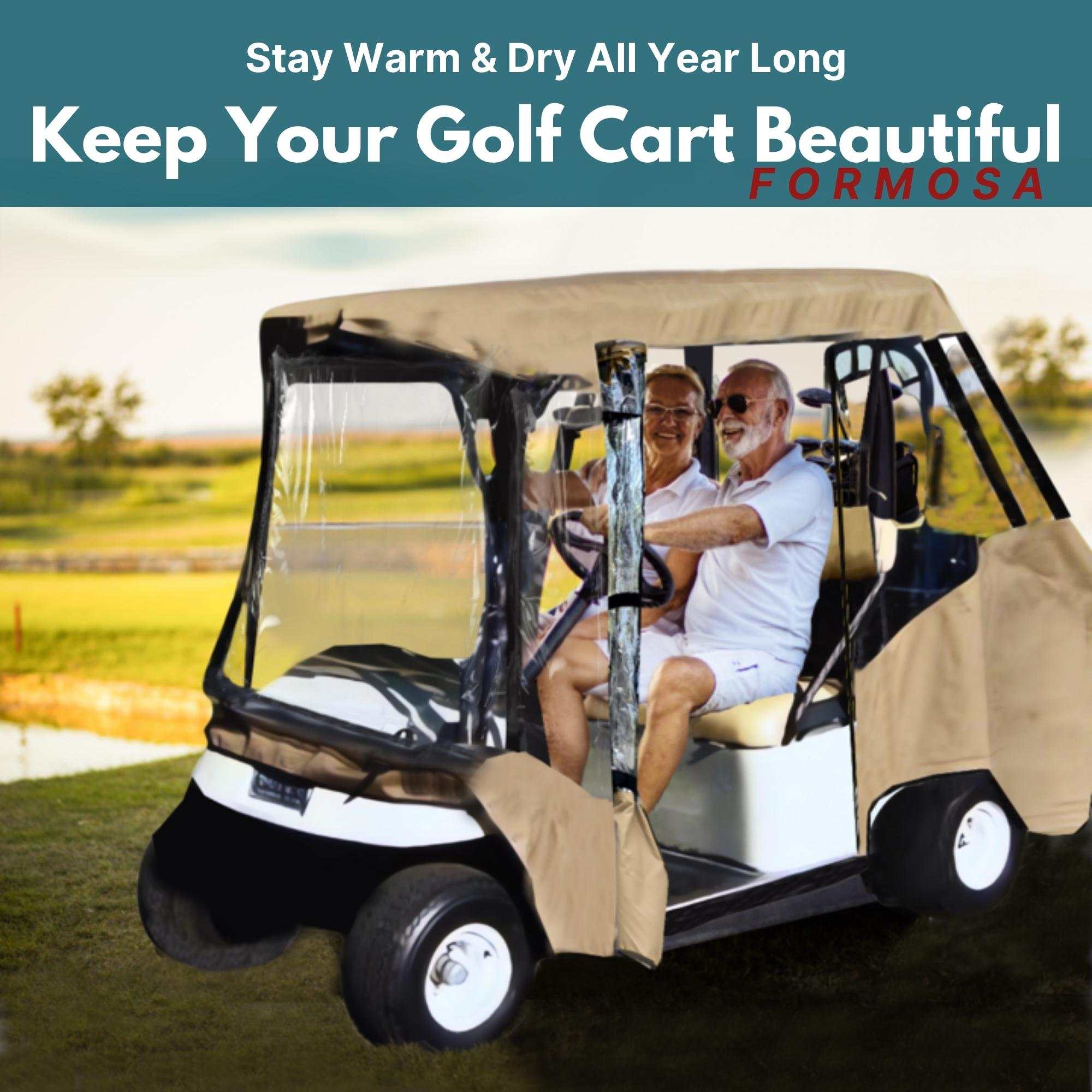 Experience Comfort on Your Golf Cart: Tired of chilly winds and rain while driving your golf cart? Stay warm and dry this season with the Formosa Covers Golf Cart Enclosure Cover. Our product has been perfected over 15 years, so you can trust in its tested product engineering.