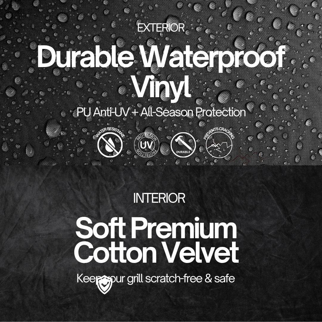 • ALL WEATHER PROTECTION: New waterproof vinyl exterior guards against extra tough weather conditions. From the fall leaves of September to the harsh Winter's rain, snow, sleet and strong winds, you can be sure your grill is safe. The sun is no match for our cover that protects against UV damage.