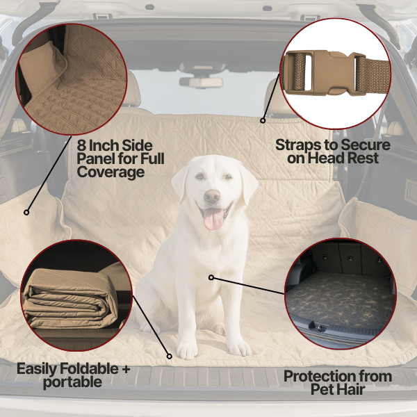 Our quilted cargo liner is ideal for pet owners looking for a dog trunk cover or car pet liner that’s both functional and comfortable. The padded, water-repellent spun polyester fabric offers a cozy surface for pets to relax on during long rides, while the durable construction shields your trunk from dirt, dander, spills, scratches, and heavy gear.