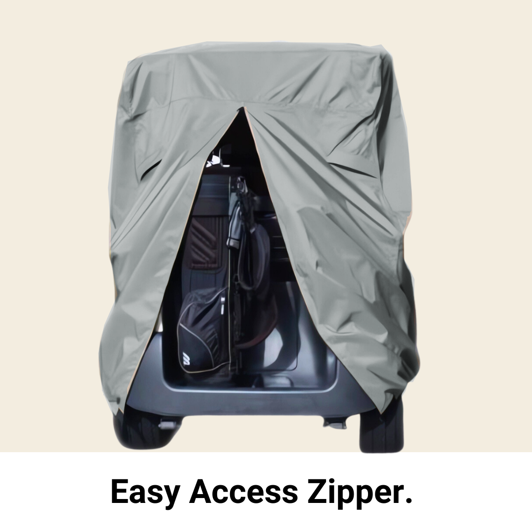 Designed for everyday convenience, the cover includes a rear center zipper for easy access and an elastic hem with reinforced grommets for a snug, wind-resistant fit. Its sleek, durable construction keeps your cart clean and protected whether stored in your garage, driveway, or on the course.