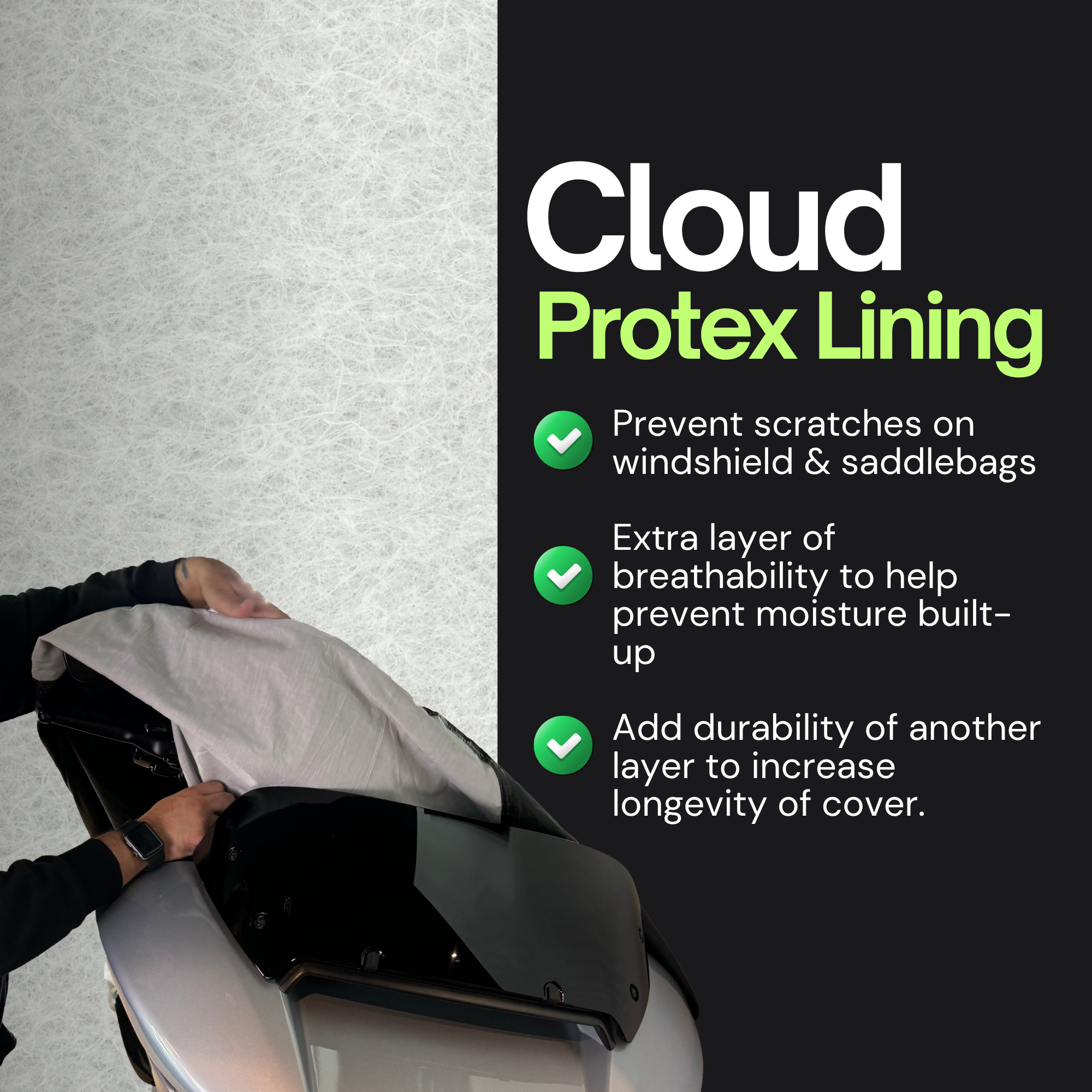 • Underneath the cover where the fuel tank area is, we have stitched in a cloth chamois panel to prevent scratches.