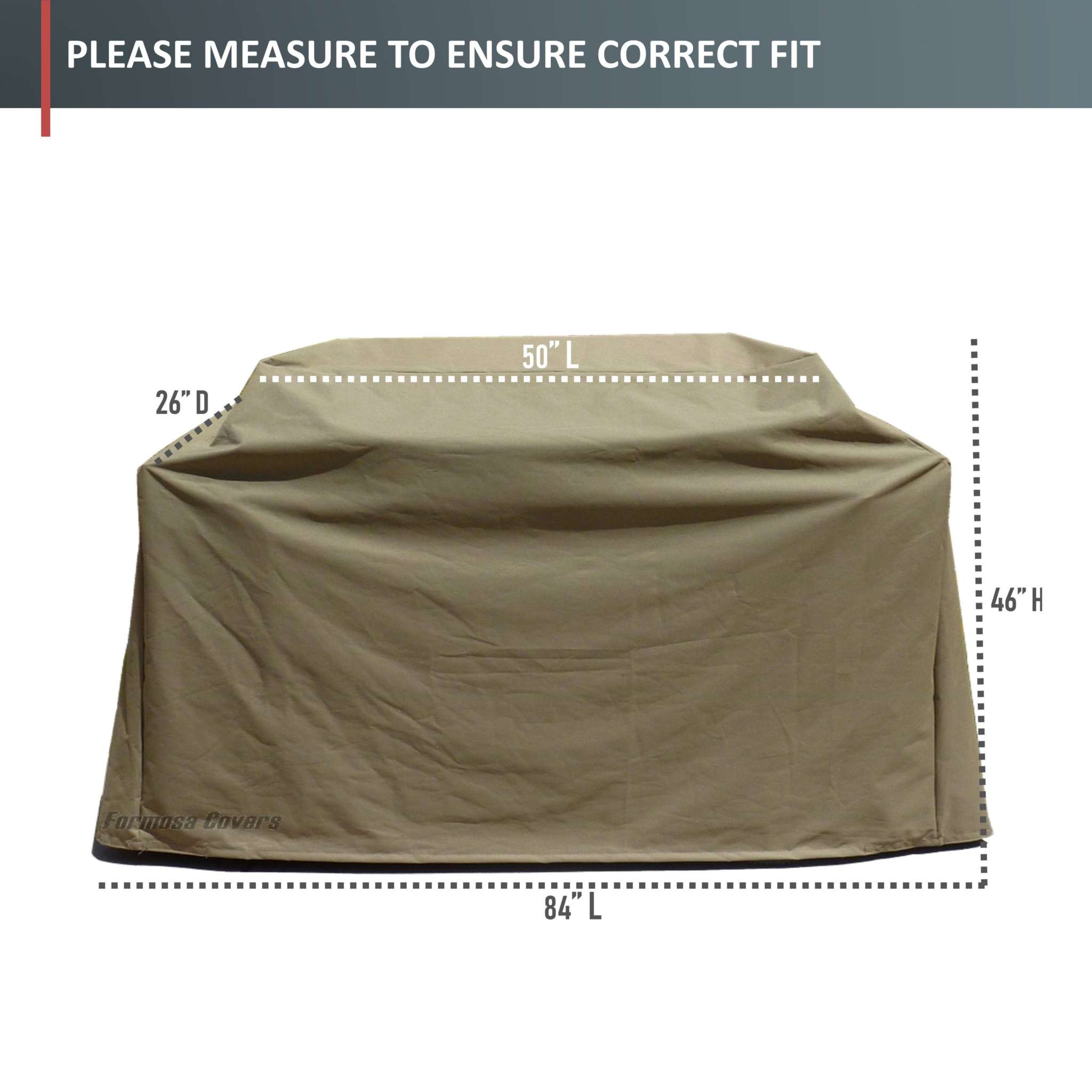 A taupe BBQ cover from Formosa Covers with dimensions: 84 inches in length (L), 26 inches in depth (D), and 48 inches in height (H). It features high heat resistance and all-weather protection. The product description advises,