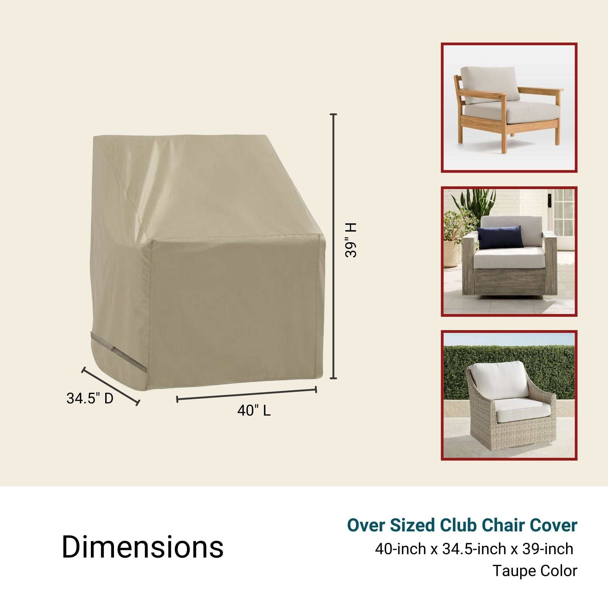 CUSTOM FIT FOR LARGER CLUB CHAIRS: With dimensions of 40"L x 34.5"D x 39"H, this cover fits a variety of oversized club chairs, including popular models like the West Elm Huron Outdoor Lounge Chair, Frontgate Graham Lounge Chair with Cushions, and Crate & Barrel Abaco Wicker Lounge Chair, Morocco Graphite Oval Outdoor Lounge Chair, and Simeon Wicker Lounge Chair. For a perfect fit, please measure your chair before purchasing.