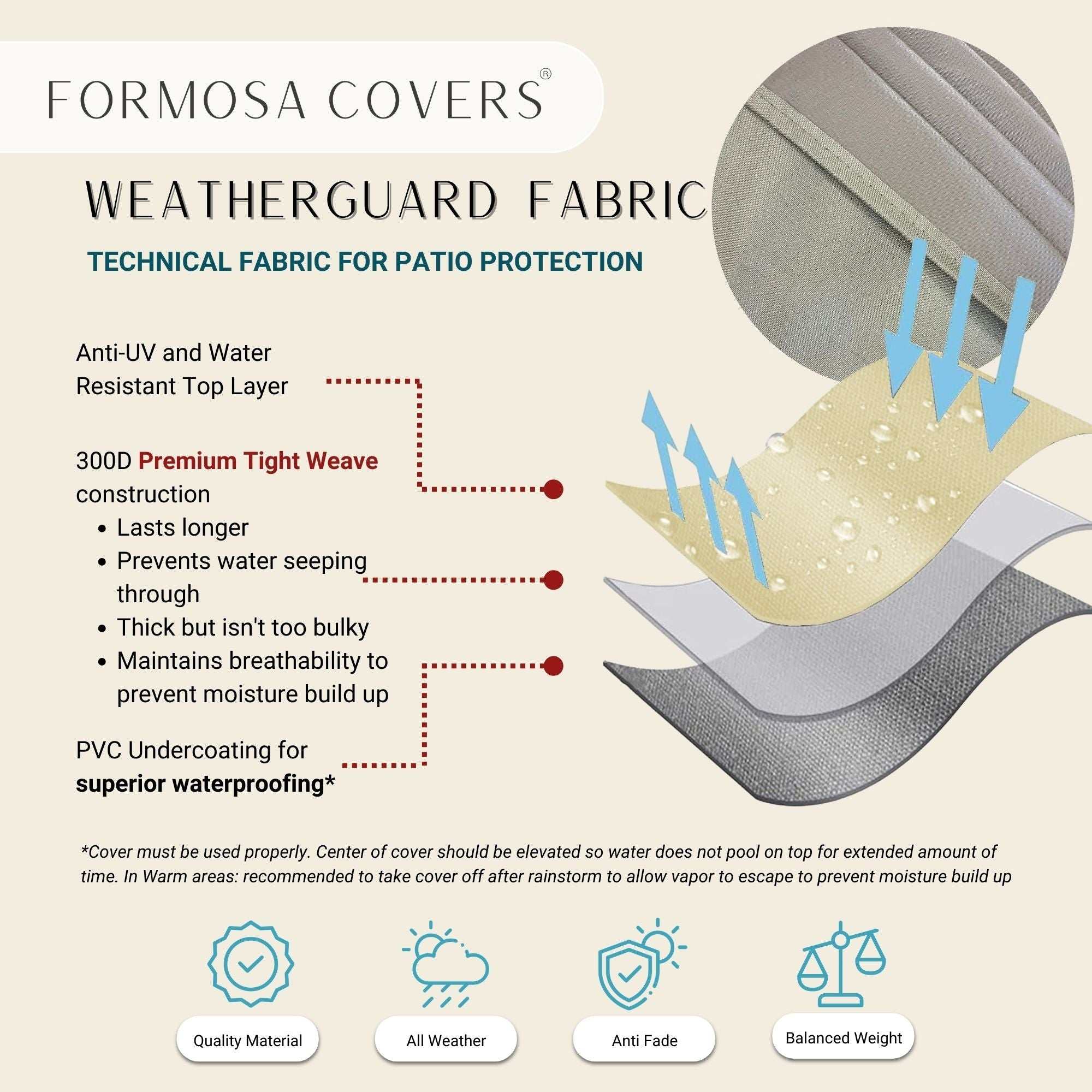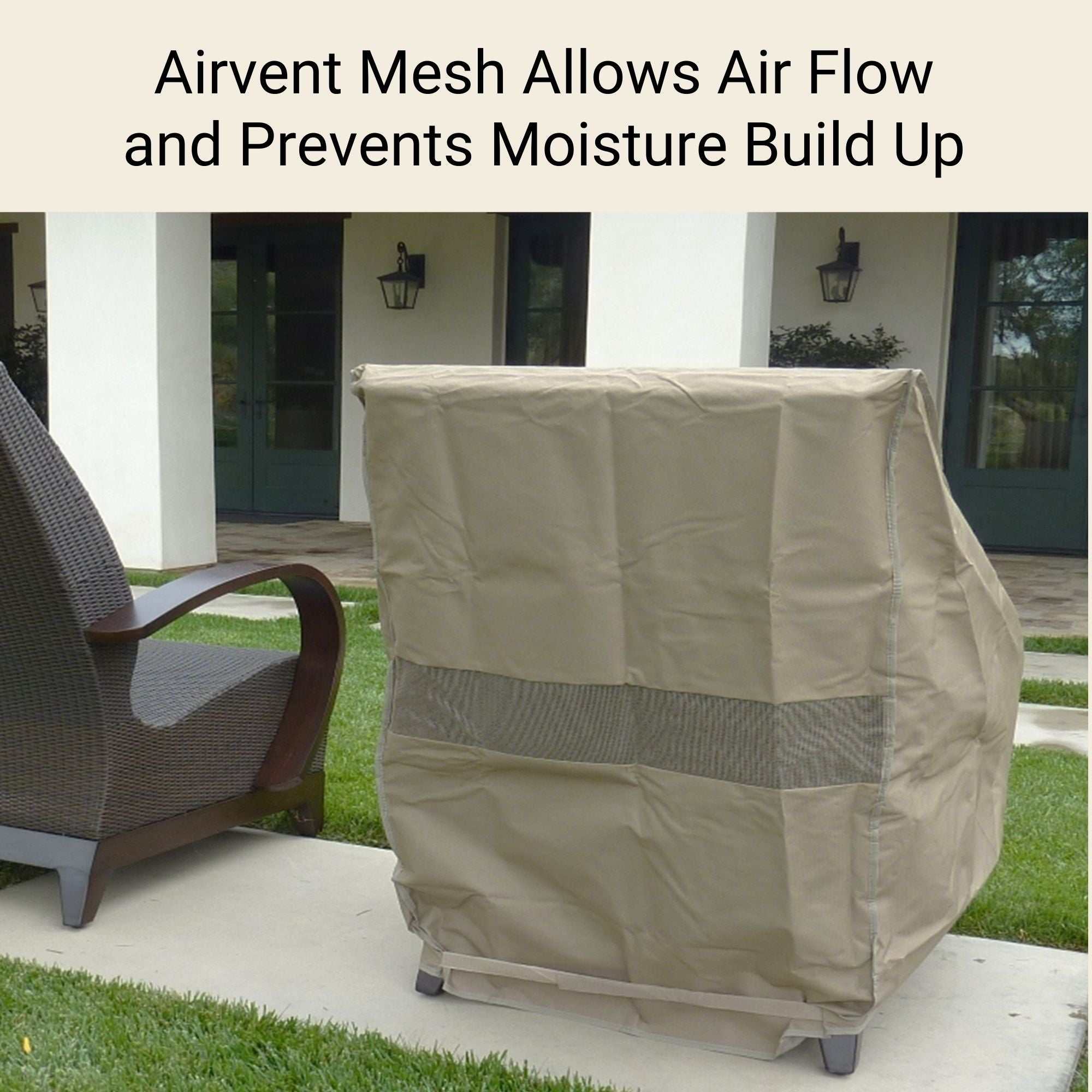 HEAVY-DUTY CONSTRUCTION: Crafted from high-quality Formosa WeatherGuard Fabric. Constructed of 300x300 denier fabric, our patio lounge chair cover features double stitching, an anti-UV coating, and a waterproof PVC backing for unparalleled durability. Equipped with air vents to prevent condensation and moisture buildup, your chair will remain dry and mildew-free.
