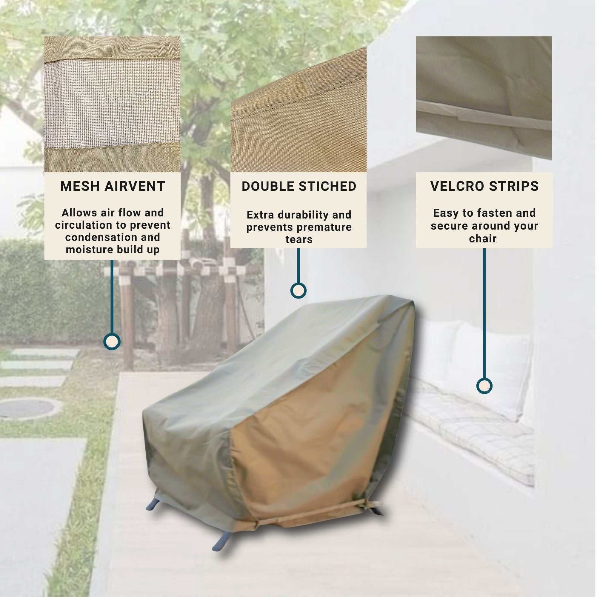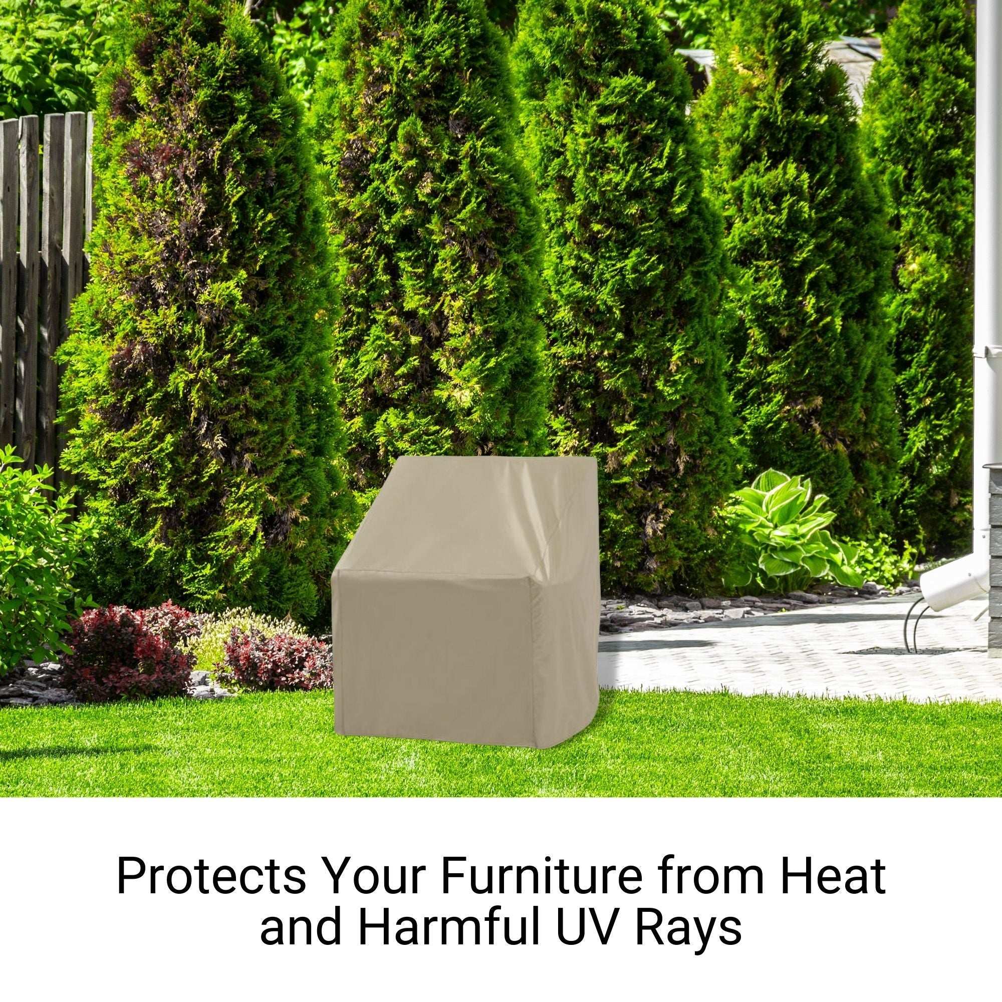 WIND-RESISTANT & USER-FRIENDLY: The peel-and-stick ties make securing this lounge chair cover quick and easy, providing reliable protection even on windy days. Its elegant taupe color enhances any outdoor decor while delivering superior coverage.