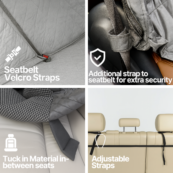• Elastic hem and 5 secure attachment points (headrest, seatbelt, tuck-ins, rear backrest)