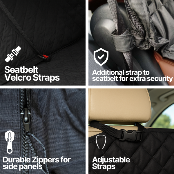 • Nonslip & SAFE - Our pet seat cover has a non-slip surface to prevent your dog from slipping every time you apply the brake. Also built-in nonslip backing and seat anchors to prevent seat cover from sliding around. Built-in velcro openings for your Seatbelts. All this to ensure your dog safe, safety is always priority