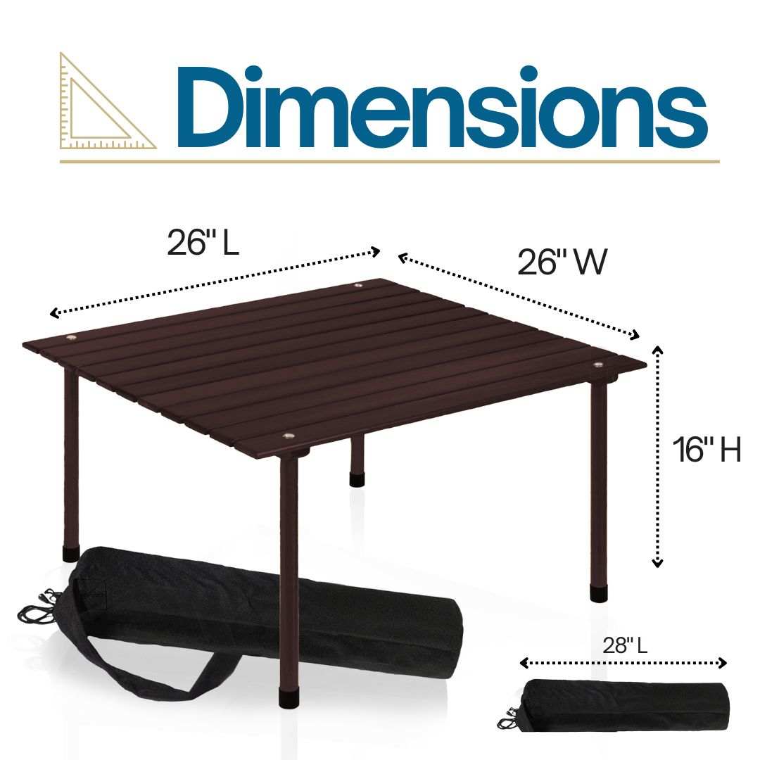 Portable Wood Roll Up Table is the perfect table for your outdoor event such as picnics, celebrations, proposals, BBQs, beach, camping, tailgating and more! Comes with a convenient sleek black carrying case. Table measures 26"L x 26"W x 16"H.