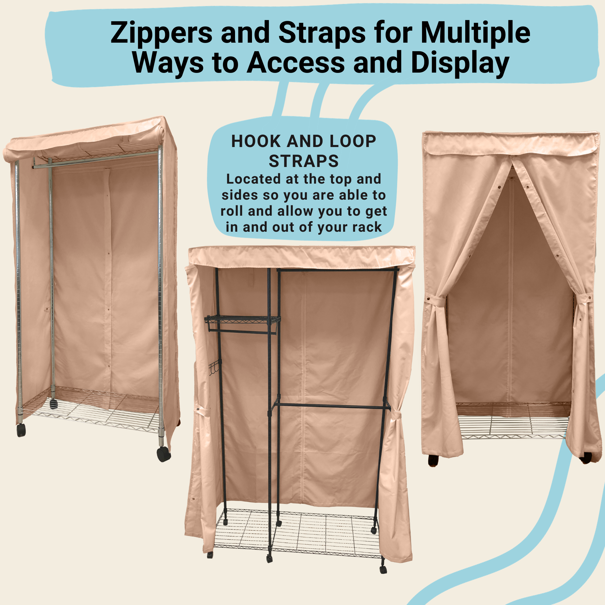 • One side of the cover has 2 corner zippers to easily slip into your garment racks. This side is also equipped with a 3-way zipper to easily open/close the garment cover