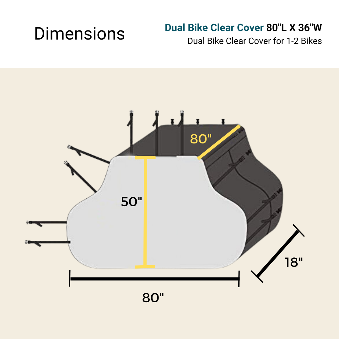 • FULL COVERAGE: This model is designed for 2 bikes. The cover dimensions are 80¢€œ long x 36" wide (Top) x 18" wide (Bottom) x 50" high. Fully encloses your bike with zipper all around the edges and drawstring to completely enclose even your hitch. Does not work on TRUNK MOUNT bike racks. Please click HERE for Trunk Mounted Dual Bike Cover.