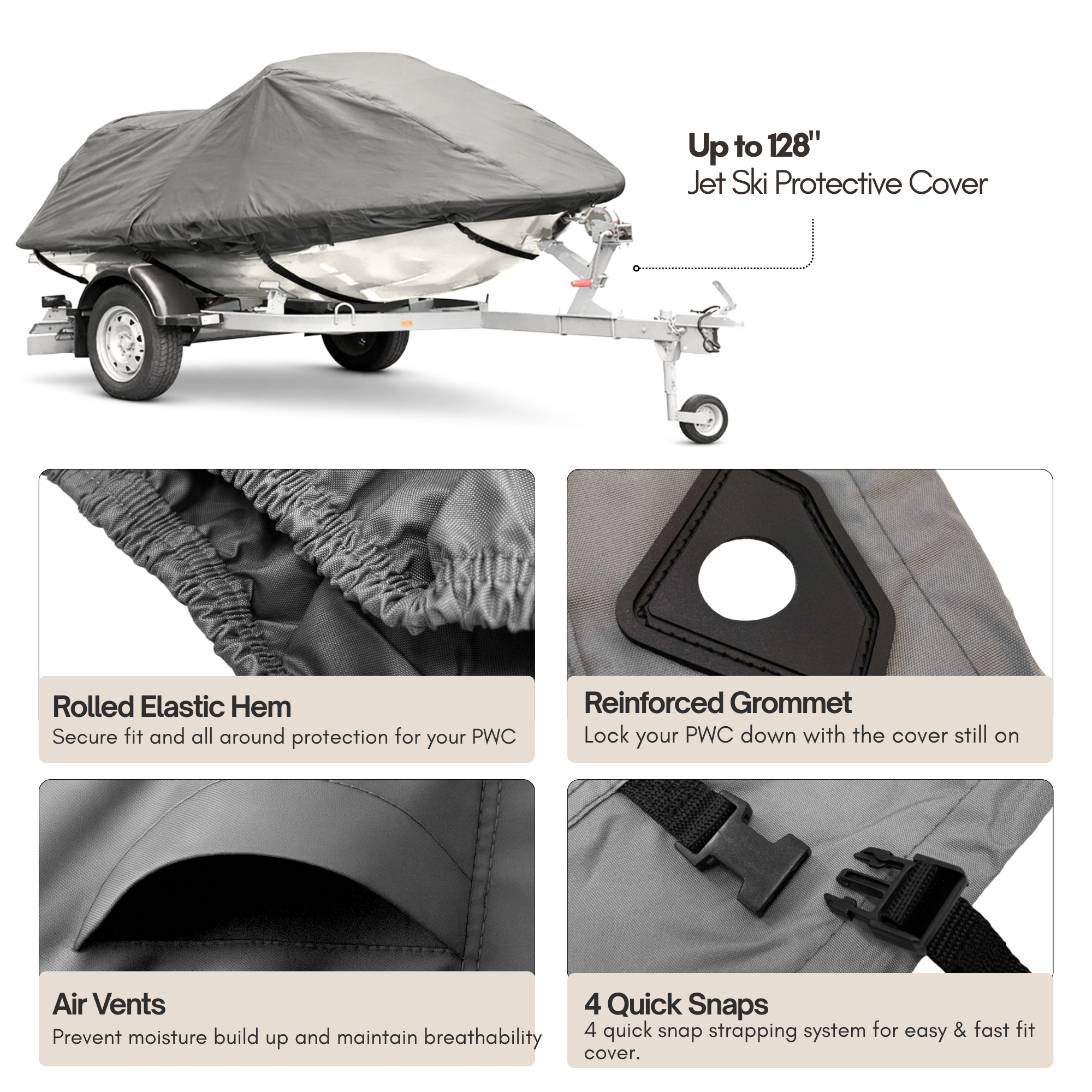 Purpose-built for mid-size personal watercraft, our premium 300 Denier Jet Ski Cover fits PWCs up to 128 inches — delivering all-season protection with a snug, reliable fit and the durability to last year after year.
