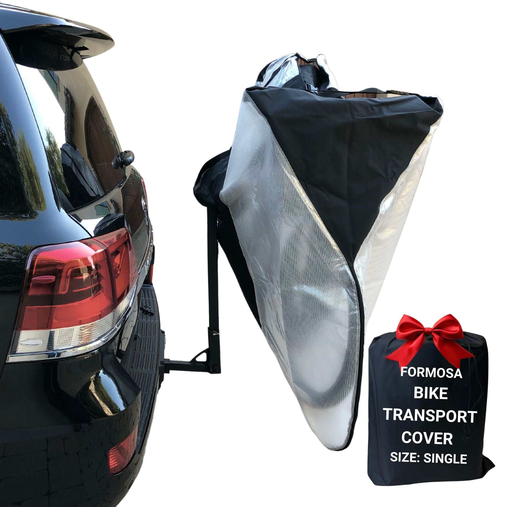 Protect your bicycle during every trip with the Formosa Covers Single Bike Hitch Mounted Rack Cover. Perfect for road trips, camping, and everyday transport, this heavy duty cover shields your bike from rain, UV rays, dirt, scratches, and road debris while traveling or storing. Designed for use with most hitch mounted bike racks, it provides full coverage and a snug fit to keep your bike safe on the back of your vehicle.