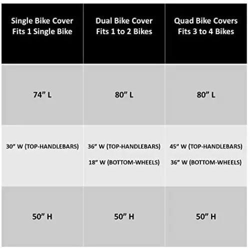 • Full Coverage Design: Fully encloses your bike and hitch with wrap-around zippers and a drawstring closure. Cover dimensions: 74" L x 30" W x 50" H. Best for standard bikes and many e-bikes.