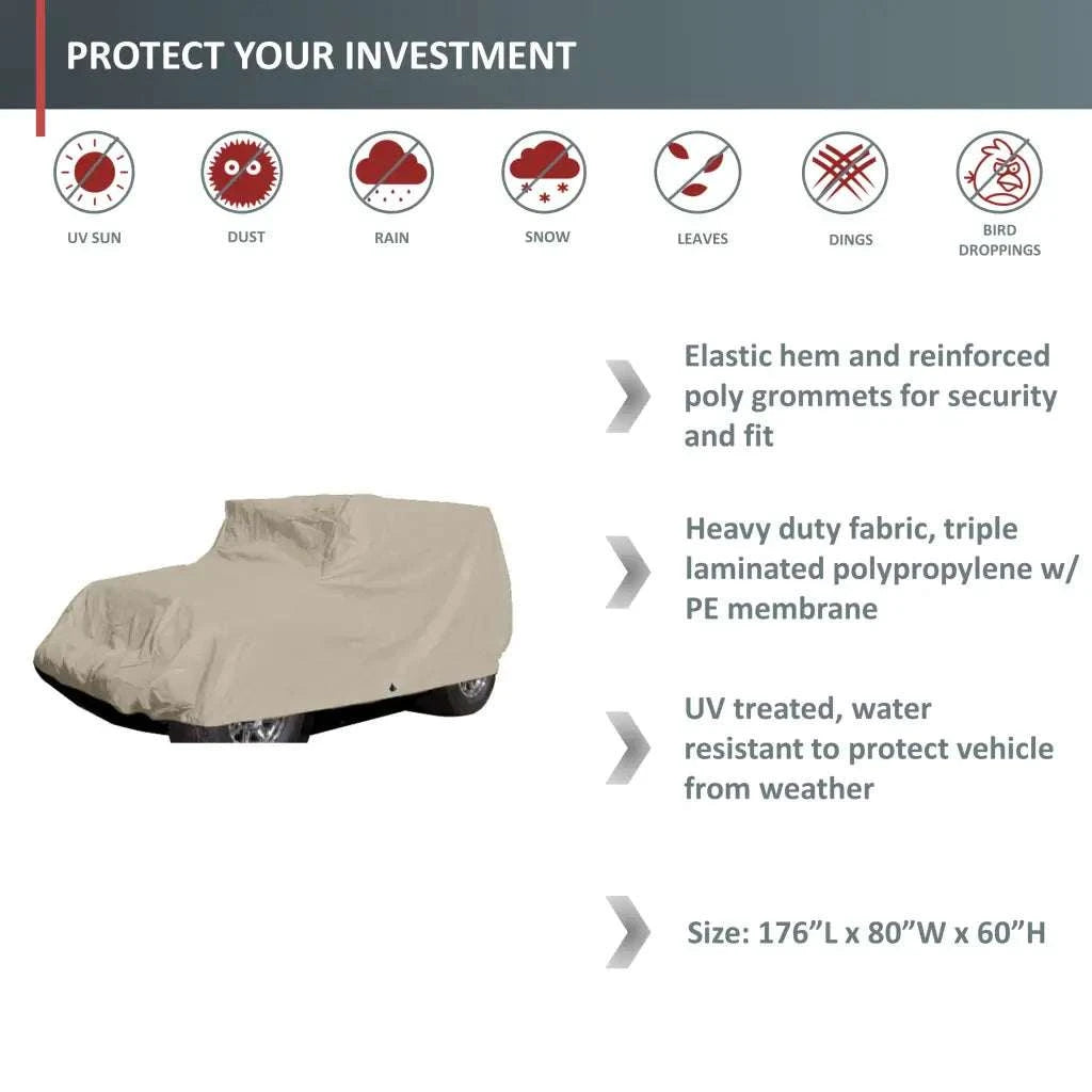 • Heavy duty UV treated fabric, triple laminated Polypropylene with a PE membrane, protect car from sun damage