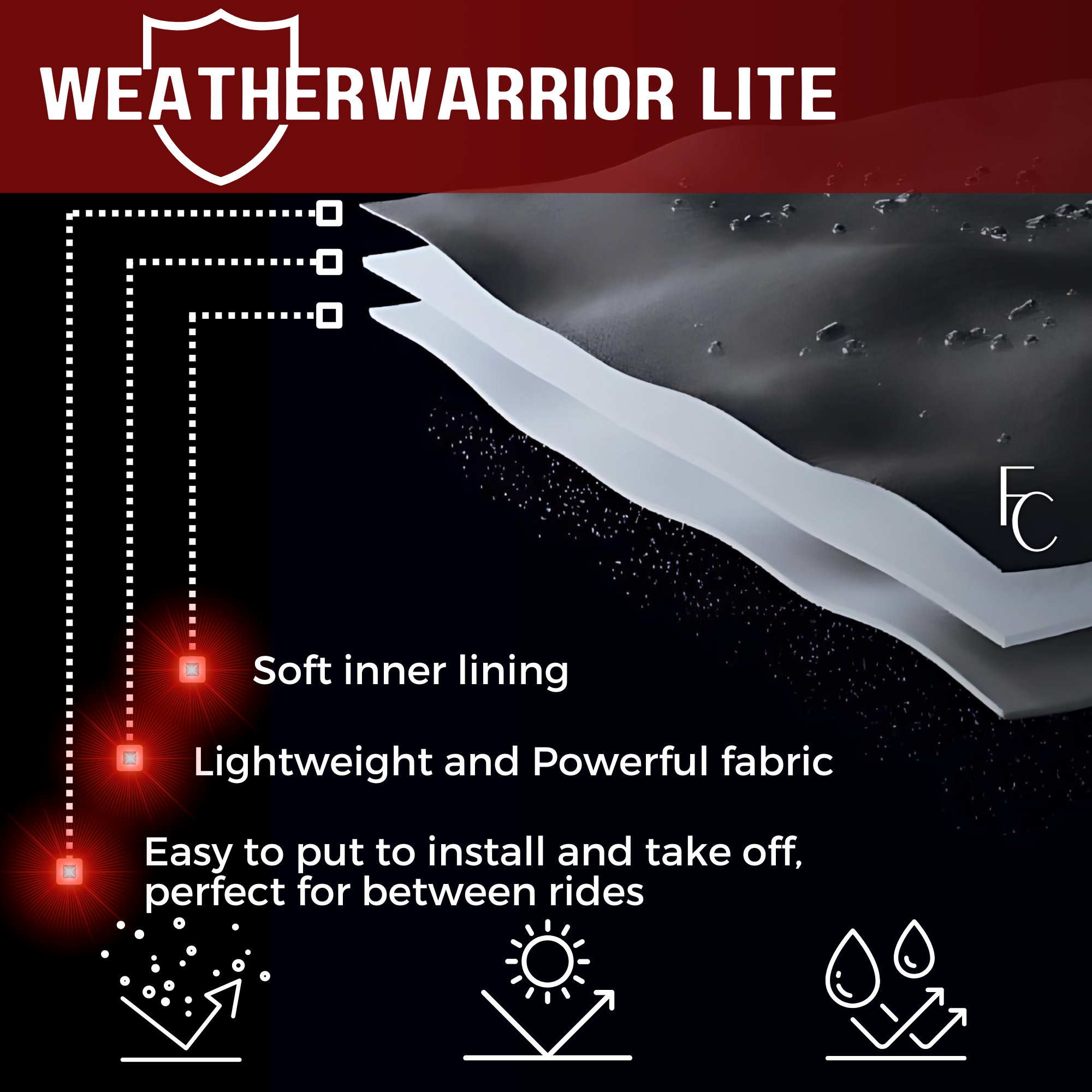 • Our unique motorcycle cover protect against rain, snow, sun, bird poop, tree sap and dirt and won't crack in cold weather.