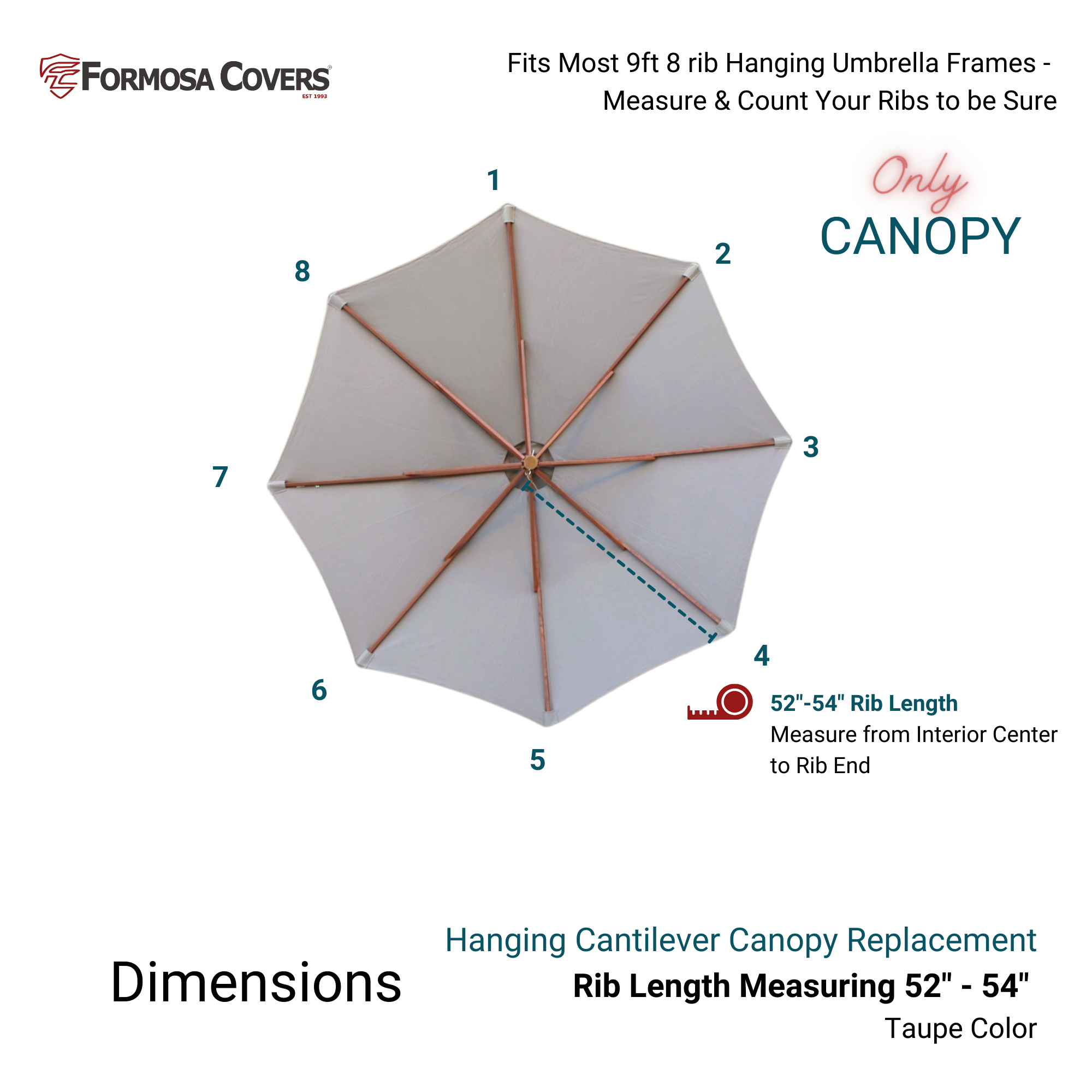 Size: 9ft 8 rib hanging cantilever canopy for rib length 52" - 54" (Hint: If you measure from the center pole please add 1.5" so 53.5" to 55.5")