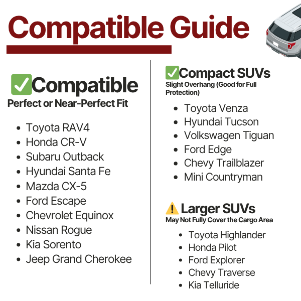 Designed with versatility in mind, this foldable cargo mat easily adjusts to fit your cargo floor’s dimensions. The buckle straps securely anchor the liner to your headrests, making installation quick and stress-free. Great for everyday use or weekend adventures, this SUV trunk liner is compatible with many popular models like the Toyota RAV4, Honda CR-V, Subaru Outback, and Hyundai Santa Fe.